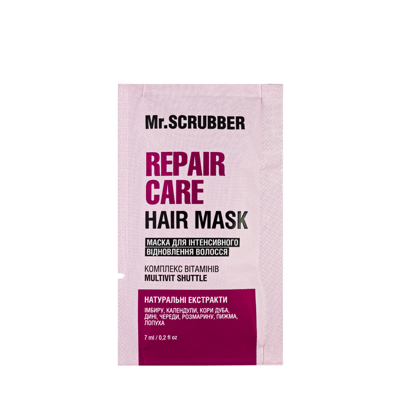 Особливості Mr.Scrubbe Repair Care Hair Mask: формула з гідролізованим рослинним протеїном, що надає відновну дію; натуральний імбирний екстракт стимулює кровообіг у шкірі голови та прискорює ріст волосся; екстракт лопуха згладжує нерівності структури; екстракт календули забезпечує захист волосся від зовнішніх факторів; екстракт живокосту допомагає боротися з лупою; екстракт кори дуба зміцнює волосся, усуває ламкість та надає об'єму; екстракт дині, збагачений цинком, дарує дзеркальний блиск та гладкість; екстракт розмарину знижує вироблення себуму та перешкоджає появі жирного блиску; екстракт пижма звичайної прискорює процес загоєння пошкодженої шкіри голови; комплекс вітамінів – F, Е, В – забезпечує зміцнення коріння волосся та надає пружність.